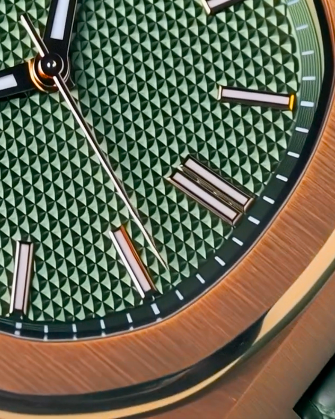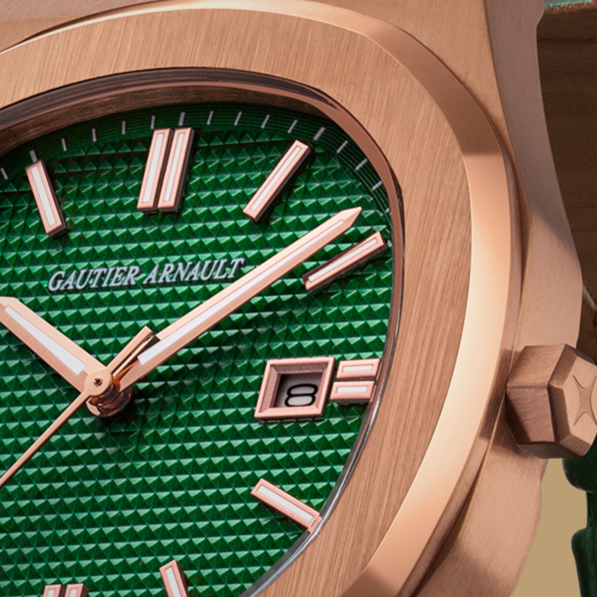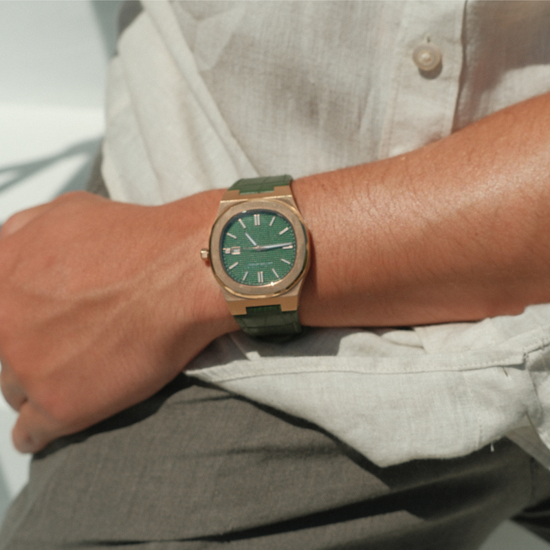 The Embroidet represents refined boldness — a watch designed for summer evenings, coastal escapes, and quiet moments of distinction. Its rose-gold case contrasts against the emerald dial, shifting in tone as light moves across it. Luminous details ensure visibility from day to night, while its slim 9 mm profile ensures ease of wear without sacrificing presence. This is sophistication expressed through color: vibrant, precise, unforgettable.