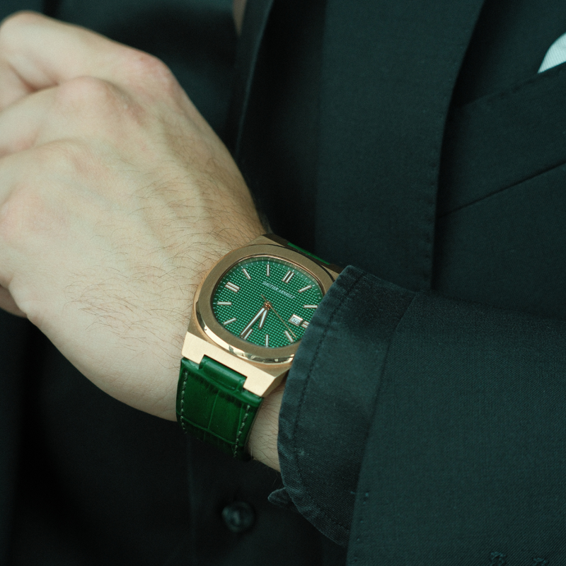 Emerald green has long symbolized wealth, vitality, and renewal — qualities that Embroidet captures with every glance at its dial. Paired with the crocodile-embossed strap, the watch becomes more than an accessory: it becomes a declaration of character. Bold yet composed, it speaks to those who know that elegance is not neutral, but alive with intent.