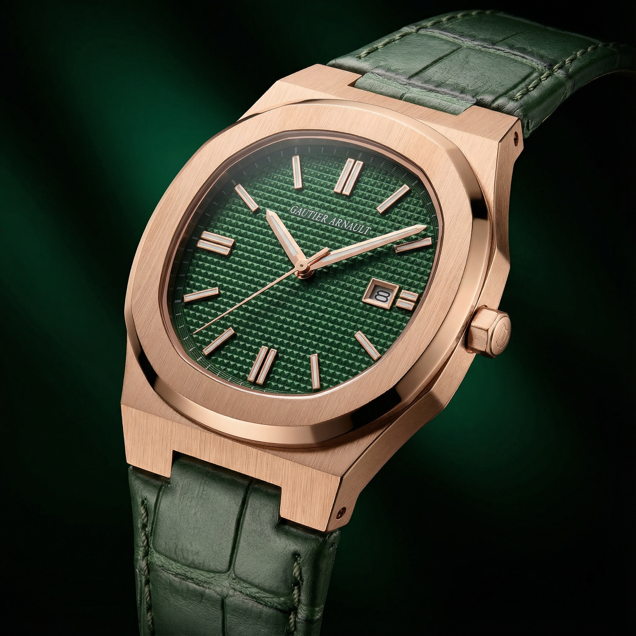 The deliberate balance of the rose-gold case and the rich emerald strap creates a synergy of materials that is undeniable.This timepiece is designed for those who know that true sophistication lies in traditional harmony and intentional design.